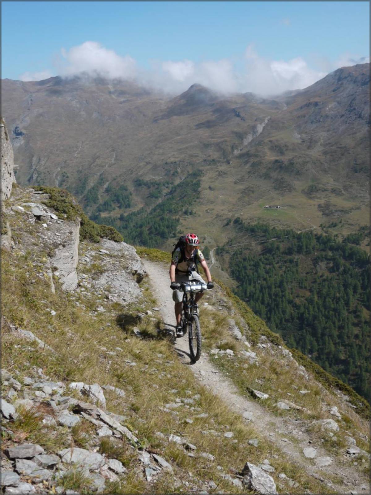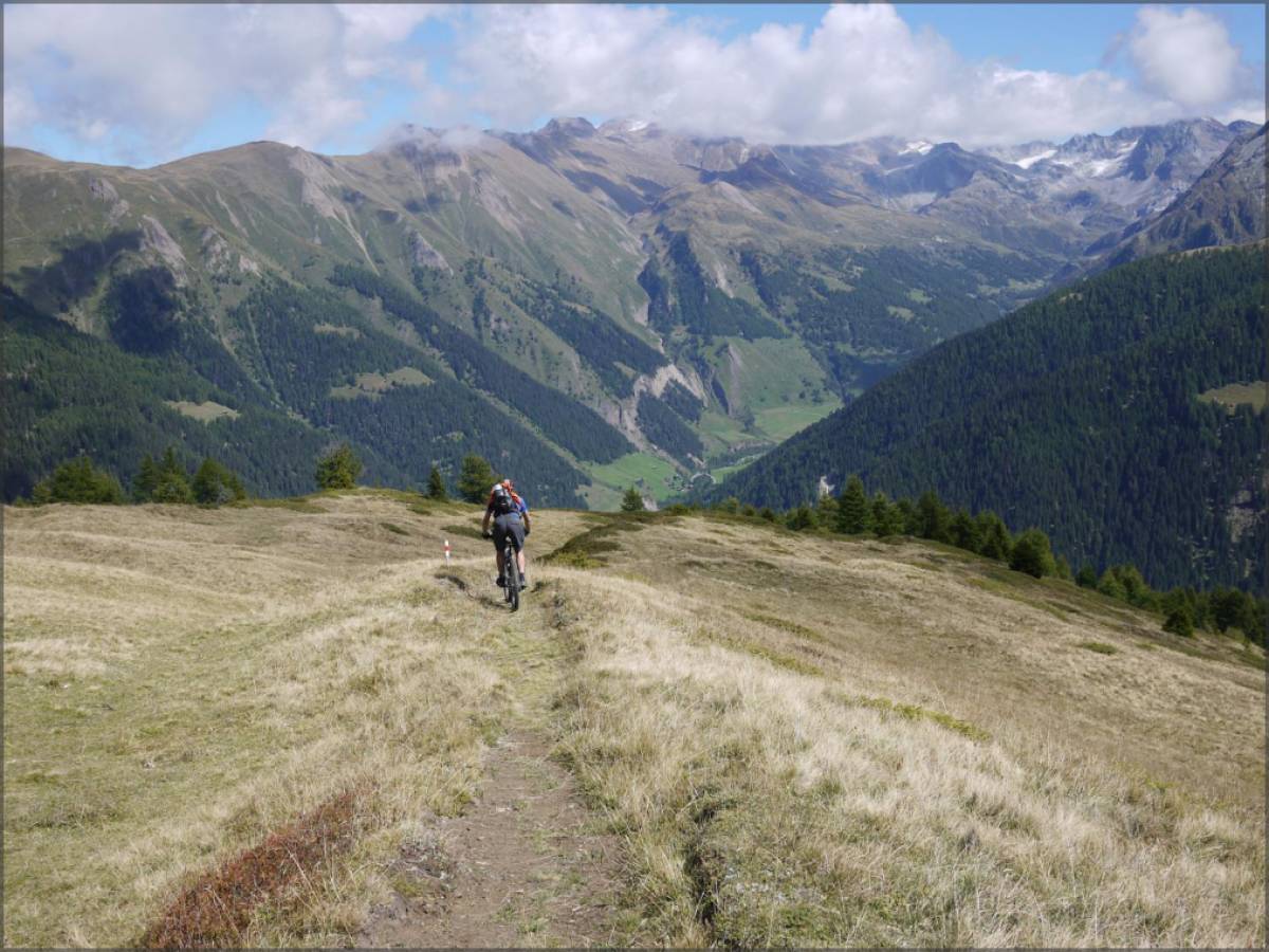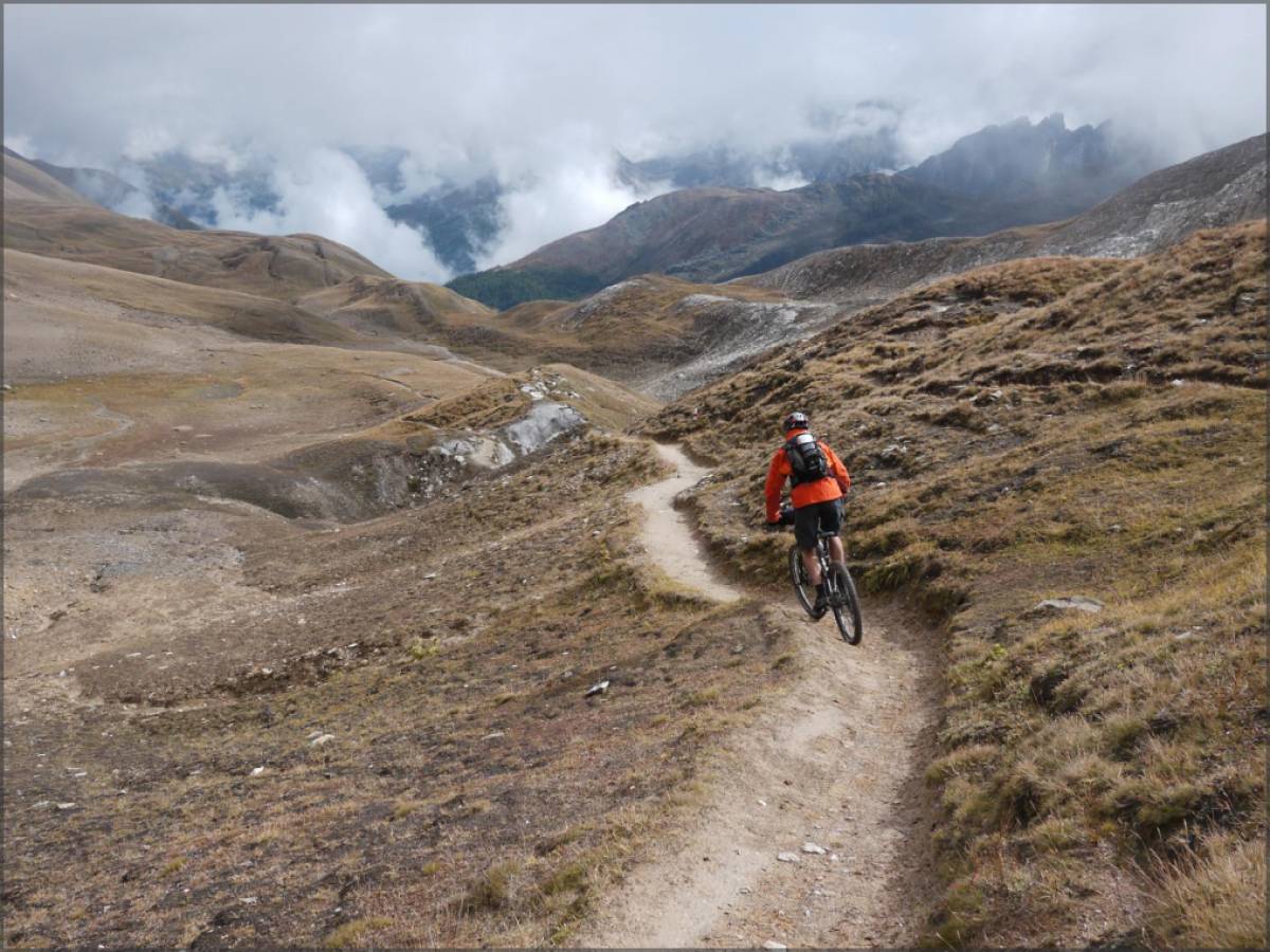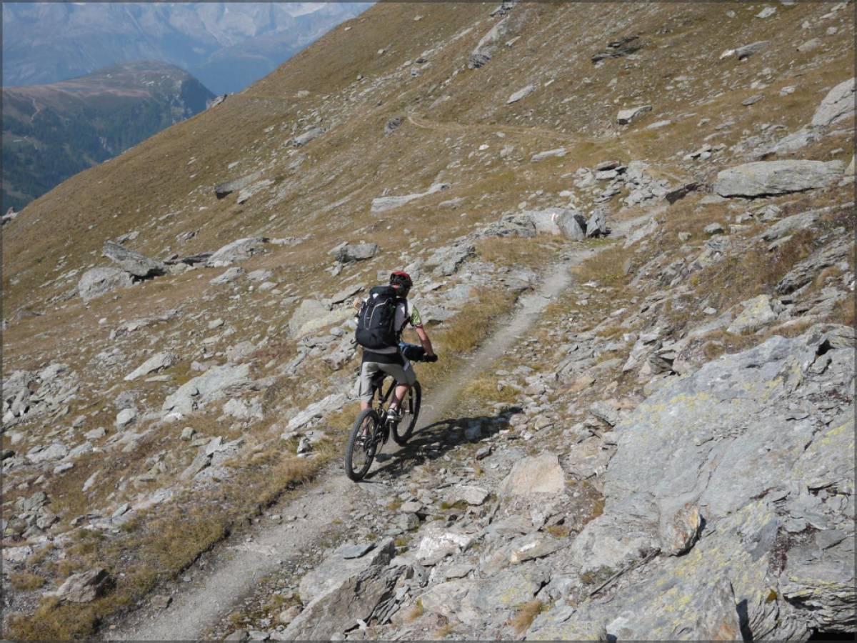 L'étape la plus technique et la moins roulante de toutes. Portage jusqu'à l'Eggerhorn pour commencer, descente technique (multiples passages en T4 [4 casques] et d'exposition forte) dans la Rappetal, portage/poussage jusqu'au Grittlesee avant une descente fantastique, mais à nouveau très technique (nombreux passages en T4 sur le haut), sur Blitzingen.
