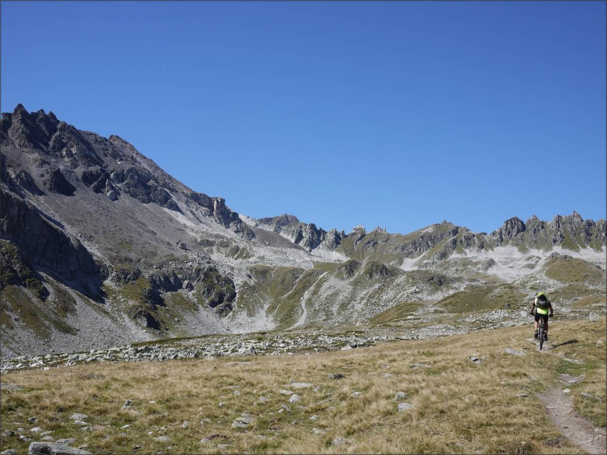 Le Meidpass se prête fantastiquement bien à une pause pic-nic. Puis, c'est une descente dans un grandiose décor alpin, d'abord sur le Lac d'Armina où un bref coup de cul permet de rejoindre la Fêta d'Août avant de poursuivre sur la Cabane Bella Tola puis Chandolin, le tout sous l'oeil attentif de la Dent Blanche !