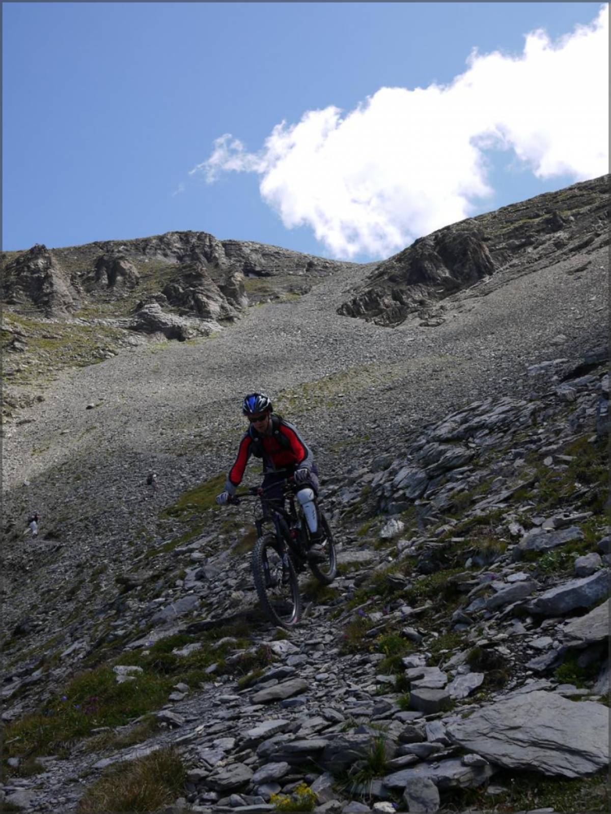 Vient alors le moment de s'équiper pour la descente. On commence par un pierrier facile (mais qui reste un pierrier...) qui permet d'atteindre le Col des Perris Blancs. On part sur la gauche pour rejoindre la Vire aux Boeufs via un single, toujours en pierrier, mais beaucoup plus technique (limite '4 casques').