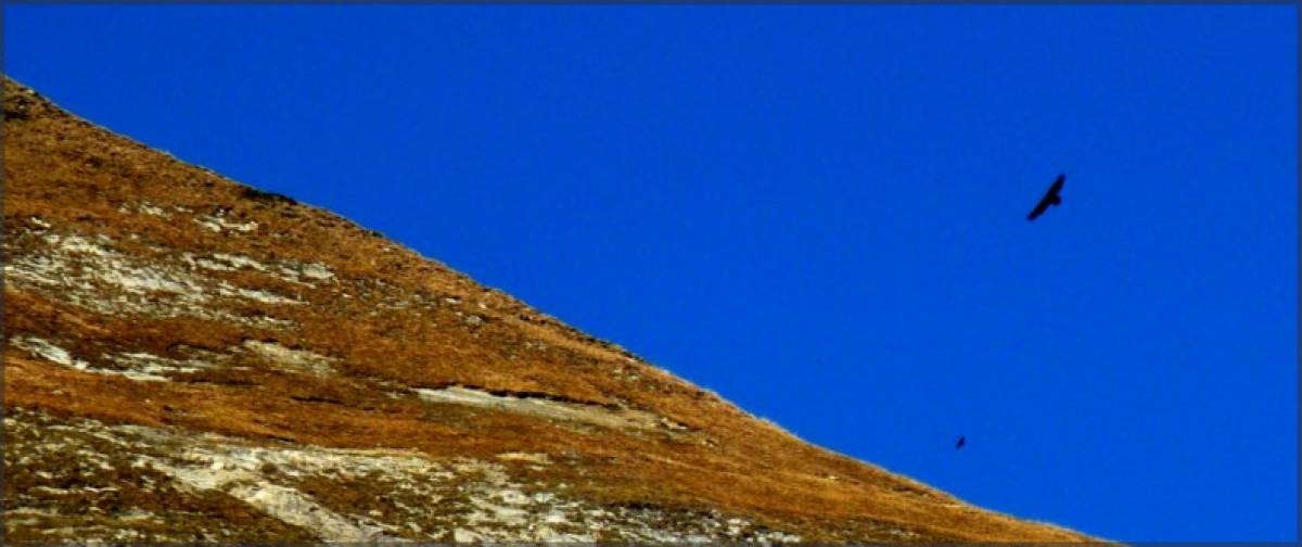 Pour la petite histoire, tout en roulant j'ai eu le temps de repérer deux aigles qui tournaient dans les rochers qui surplombaient l'alpage. Je m'arrêtai pour contempler le spectacle et un homme qui descendait en voiture s'immobilise à côté de moi et me montre trois gypaètes qui enroulent un thermique en compagnie de corbeaux. Dommage que je sois un peu trop éloigné pour bien capturer cet instant...