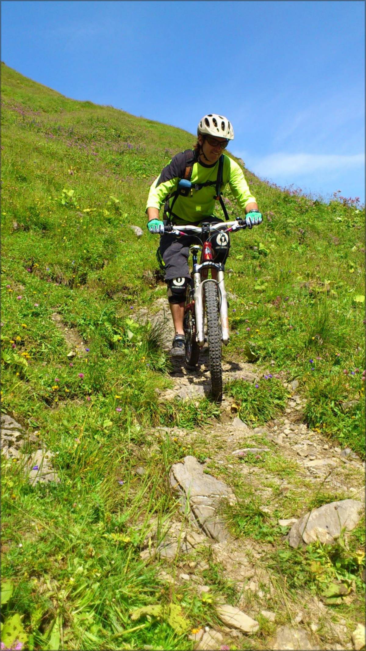 Du Waldnachtersee, il est aussi possible de rester sur la piste qui monte légèrement en direction de Brüsti afin d'emprunter le single qui plonge sur la droite au point 1436. Le début du single est technique et se déroule sur un terrain plutôt rocailleux, qui pourrait s'avérer glissant par temps humide. On croise une route au point 1244 et le sentier devient à nouveau plus technique, avec quelques épingles sur un terrain à nouveau rocailleux, et pour corser le tout, qui semble avoir de la peine à sécher... On suit le sentier jusqu'à une nouvelle route au point 843, on pose nos crampons sur le bitume pour à peine sur 20m, jusqu'à l'épingle, pour reprendre le sentier qui descend sur Obermatt puis Mettlen.