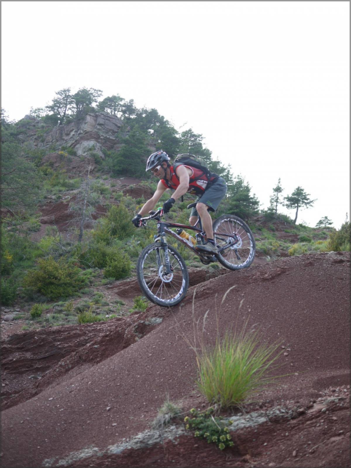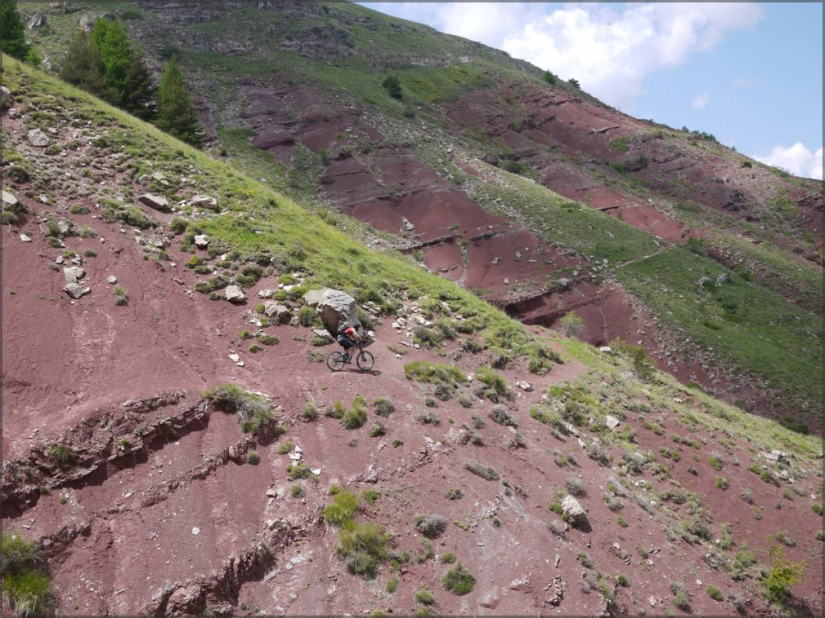 Au col, le paysage se transforme et le rouge se fait de plus en plus présent. On poursuit la piste, bien moins pentue, jusqu'à son terme en passant par le Col de Pras. Ensuite, mélange de roulage, poussettes et petits portages, dans un environnement flamboyant de pélites rouges, jusqu'au Col de Sui, en passant par le Collet de la Vigude.
