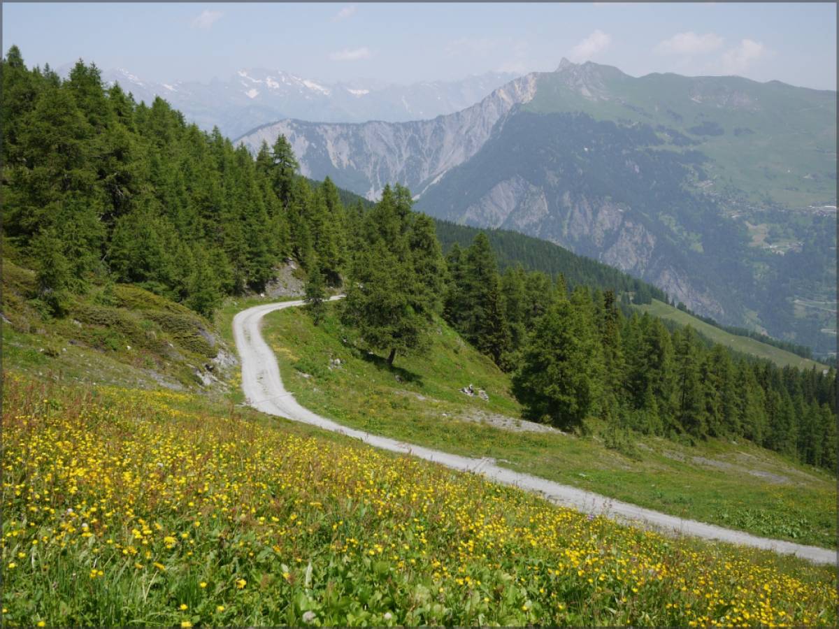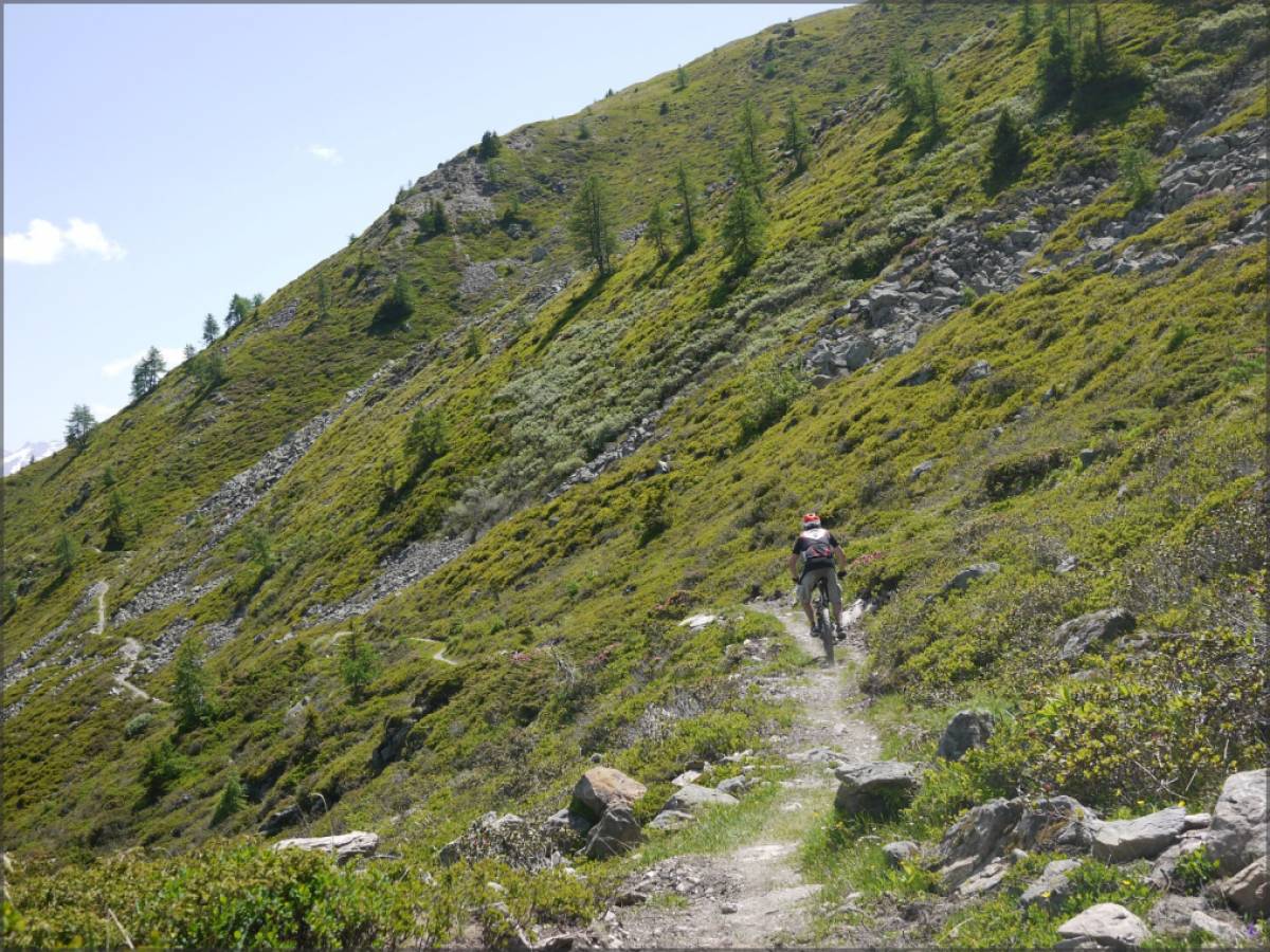 Au départ de Bruson, on se contente de la route, peu fréquentée, pour monter en direction de 'La Pasay' (les gros-mollets pourront toujours couper et emprunter la piste qui court-circuite les virolets de la montée, mais le commun des mortels préférera commencer tranquillement...). Peu après 'La Côt', la route fait place à une piste très lisse avant de franchement céder le pas à une piste gravillonneuse, mais toujours très roulante, aux environ de 'La Pasay'. On poursuit sur la piste jusqu'au point 2100 où on la quitte pour emprunter le single, balisé VTT, qui mène aux écuries de Mille. Ce single est étonnamment roulant et, passé 'La Payanne', devient même carrément ludique !