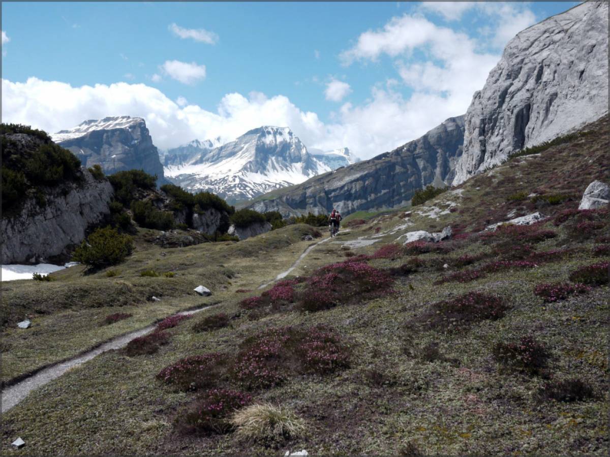 Au départ de Flims, on se dirige tout d'abord vers Trin où les choses sérieuses commencent assez rapidement. Une longue et pénible montée est nécessaire pour grimper jusqu'à l'Alp Mora. Après quelques tours de roues sur goudron, on emprunte rapidement une piste que l'on ne quitte que pour se diriger vers l'alpage de Muletg, au pied de l'Alp Mora.