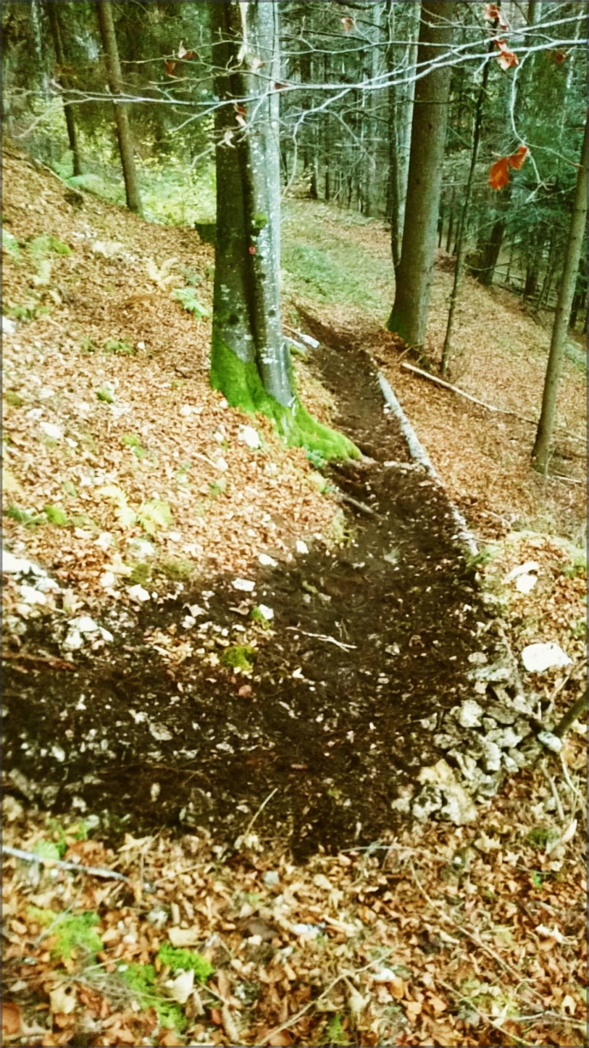 La partie haute est assez cross-country, après le pâturage le sentier est un peu plus travaillé puis enchaîne sur le sentier du Sergent 'classique' avant de bifurquer sur la partie basse pour une partie plus technique avec de la pente et quelques relevés et jumps.