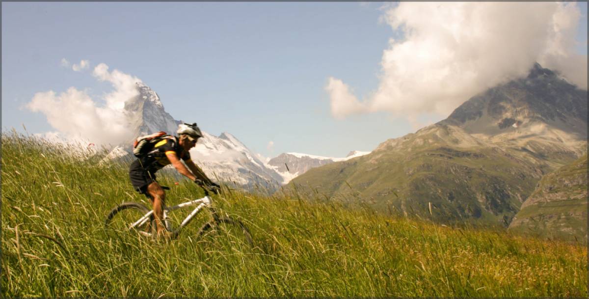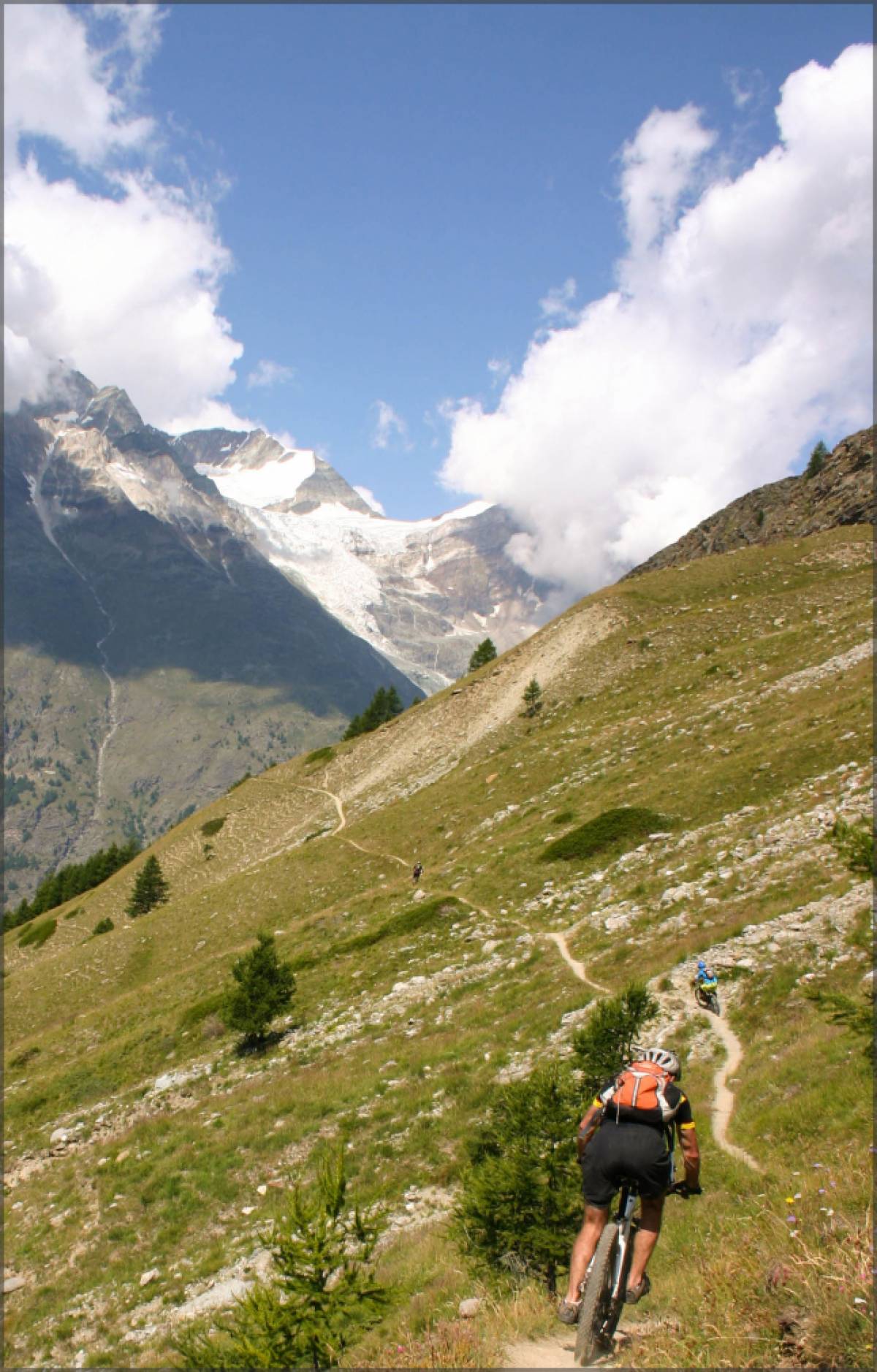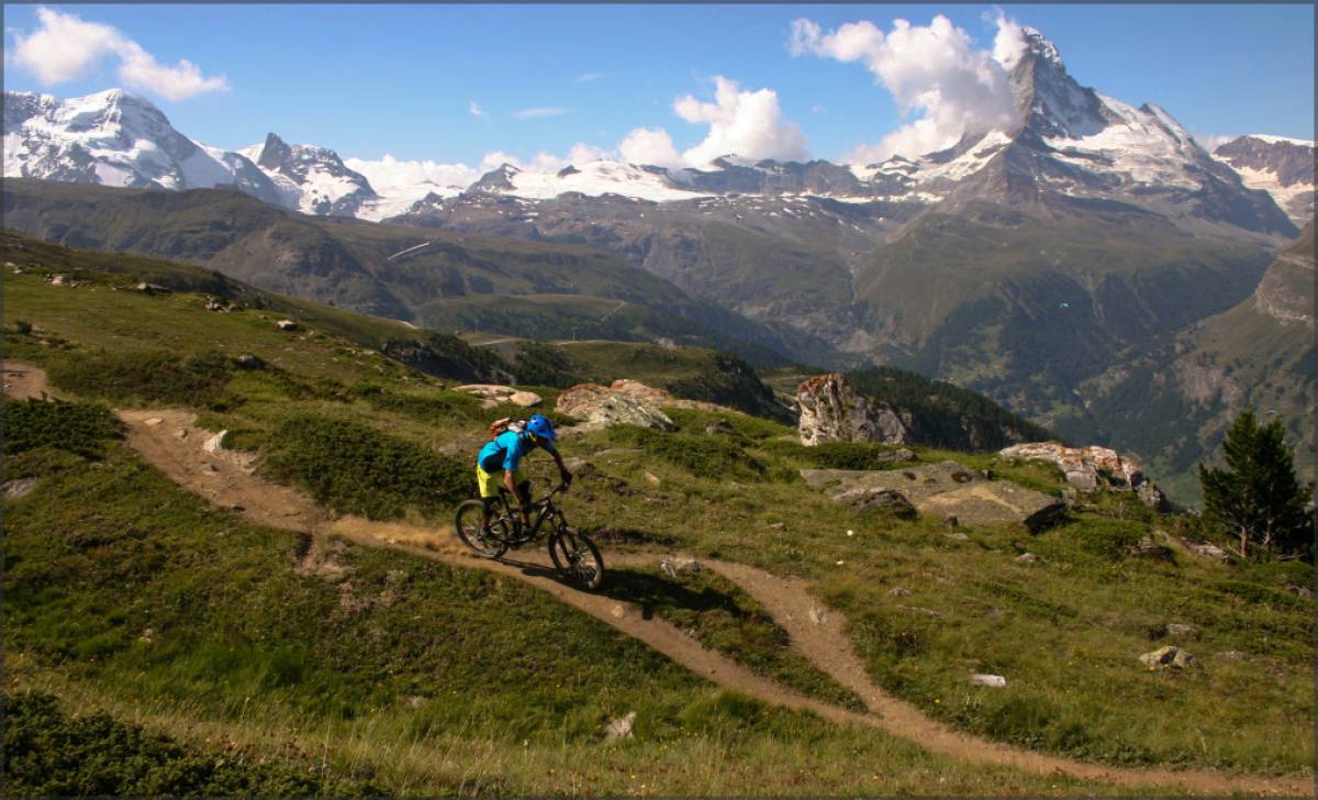 Un panorama majestueux: un tiers du parcours s'effectue avec le Cervin en arrière plan (votre appareil photo appréciera), un cinquième du parcours suit des singles surplombant de plusieurs centaines de mètres la vallée
