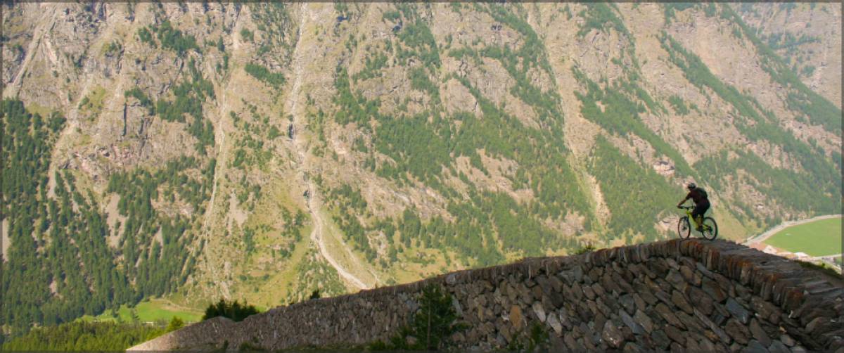 Un rustique téléphérique comme on en trouve dans pratiquement chaque bled haut-valaisan vous amènera jusqu'à Jungen. Durant la montée en cabine, admirez en contre-bas l'irrésistible single qui serpente la falaise... Eh bien il faudra y résister car il n'est pas au programme pour ce tour :P Mais qu'à cela ne tienne, le single qui mène de Jungu à Moosalp et ses quelques vertigineux passages saura ramener votre concentration sur votre roue avant! Il s'agit là de la 2e "grande" montée de la journée: 300m D+.