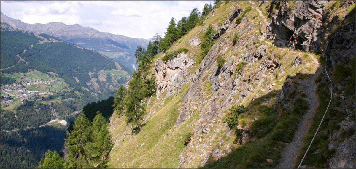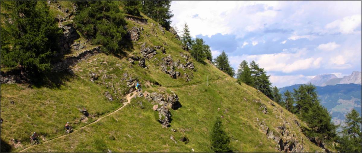 Arrivés à Blauherd, vous retrouverez un single qui vous fera enchaîner un beau nombre d'épingles de paturage (terre et cailloux) avant de vous lancer sur Europaweg, un magnifique single en faux plat montant qui surplombe la vallée. Vous traverserez l'alpage de Täsch, puis continuerez encore env 2km sur le single avant de vous lancer dans une longue série d'épingles de forêt. Le début est engagé et technique mais la descente devient rapidement plus abordable.