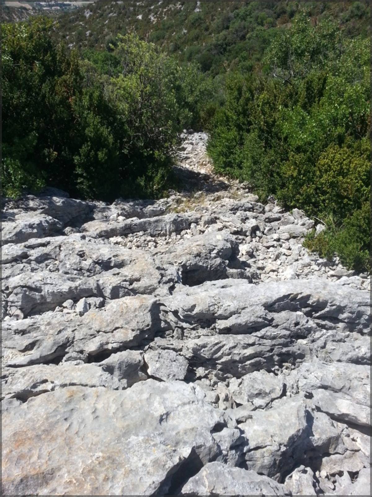 Une fois cette première descente vite avalée on va remonter par la piste 4x4 jusqu’au Col d’Eyrole puis suivre la direction de Saint-Remèze. Le chemin 4x4 laisse progressivement place à un petit single qui, doucement mais sûrement, commence à descendre avant d’arriver à un Lapiaz qu’il faut traverser en portant son vtt…ou pas... La suite est un single en sous-bois parsemé de bon gros pierrier typique du coin jusqu’à atteindre la route touristique qui relie Vallon à St-Remèze. Remonter la route sur 100-200m puis prendre le chemin qui descend à droite jusqu’à rejoindre le GR4F (itinéraire pédestre) que l’on suit sur un petit kilomètre avant de bifurquer sur la piste qui descend à gauche.