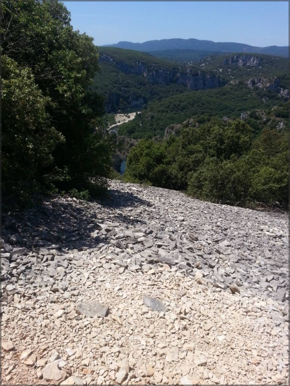 Pour la fin du parcours, on suit le GR4F, déjà emprunté précédemment, en direction de Vallon-Pont-d’Arc. Dernière descente assez longue et éprouvante, parsemée de nombreux cailloux et grosses pierres, sympa mais pas inoubliable.