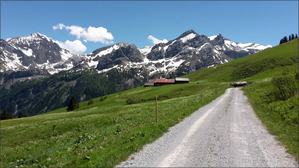 On commence par une montée sur piste interdite aux voitures, plus raide depuis pt 1726 pour finir en portage aux derniers 50m de dénivelé jusqu'au Blattipass. Vues magnifiques du massif des Diablerets jusqu'aux Bernoises durant toute la montée.