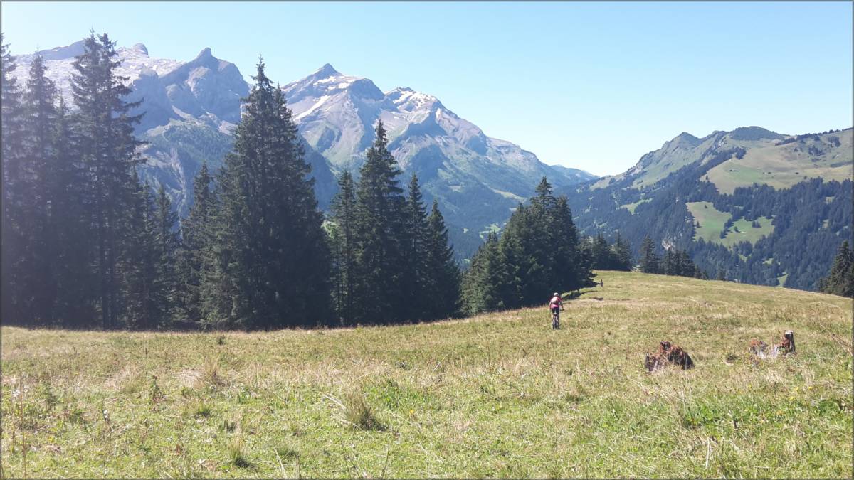 Ca roule toujours jusqu'au pt 1866, suivent 700m de distance parfois à pied, parfois en selle... Puis c'est une section carte postale jusqu'à Chrine, avant la courte remontée qui réveille pour atteindre le pt 1703.