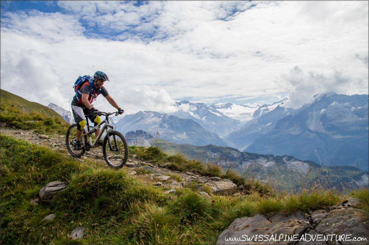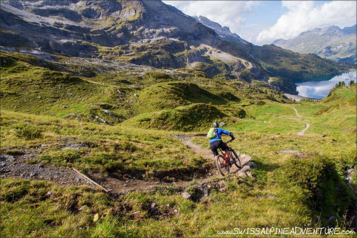 Le tour commence directement au Jochpass (2207m), accessible via les remontées mécaniques d'Engelberg (ou à la force du mollet depuis Engelberg, mais bon, c'est long quand même...). De l'arrivée des remontées, prendre directement à droite et suivre les indications 'Engstlensee'. Le sentier démarre presque immédiatement, et la vue plongeante sur le lac est à couper le souffle...mais ne vous laissez pas distraire, le sentier requiert tout de même une certaine concentration. C'est un mix de sections rocailleuses techniques parsemées de quelques épingles, et de sections rapides et fluides. Parfait pour démarrer une belle journée de ride !
